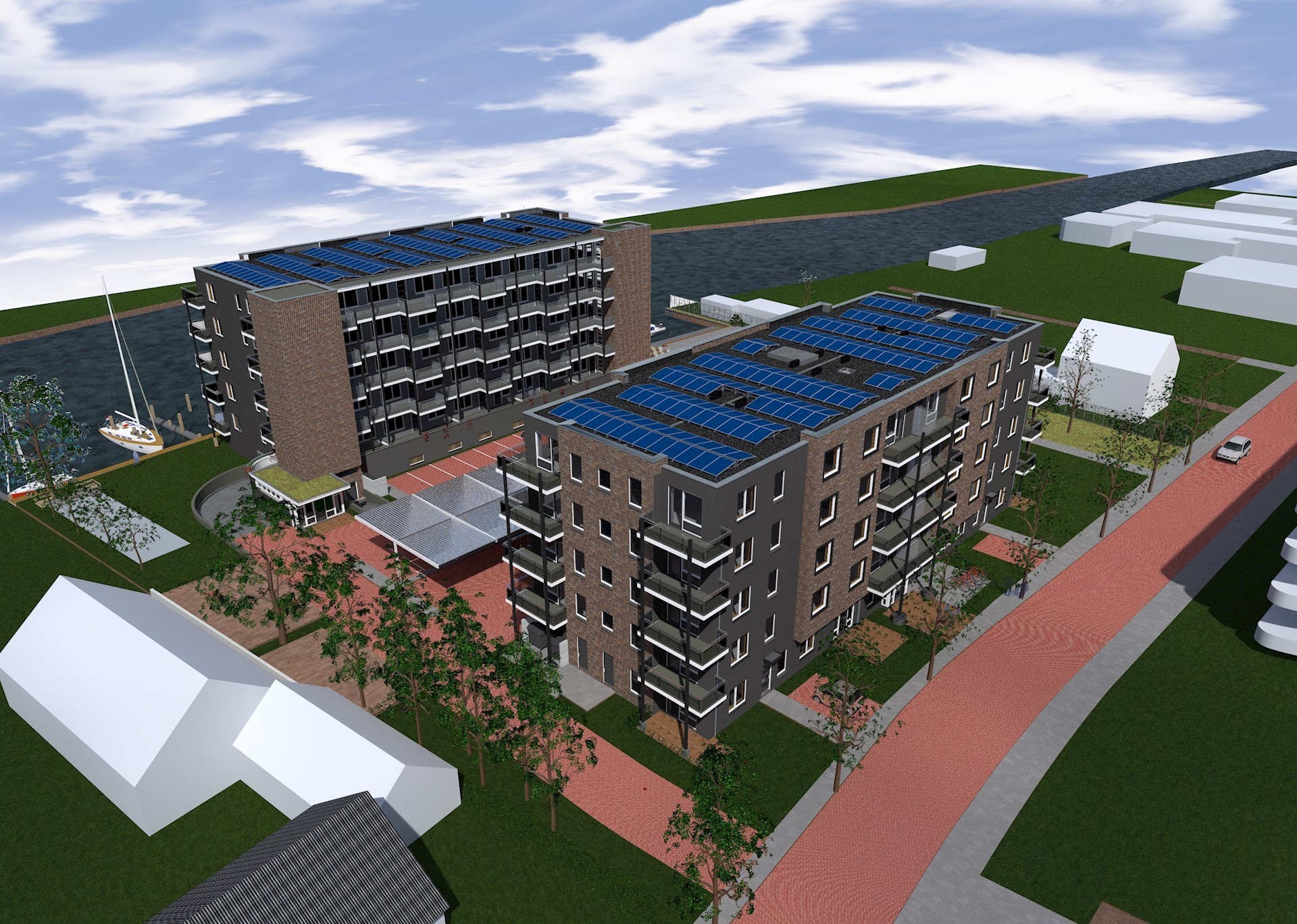 Watermerk Sneek/Appartementen Doelgroep: Starters, mindervaliden. Project Watermerk bevindt zich aan de IJlsterkade in Sneek. Watermerk ligt op loopafstand van het bruisende centrum van Sneek. In dit project zijn 16 3-kamerwoningen, 16 studio's en 2 minder valide duurzame sociale - vrije sector (midden segment) huurwoningen gerealiseerd.
